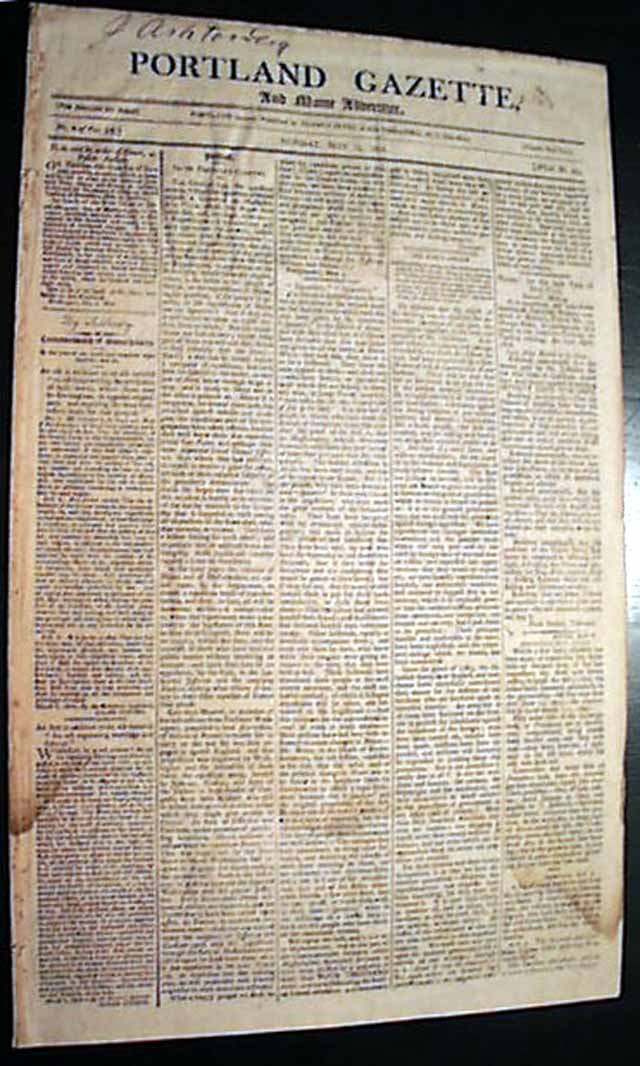 AI notes: The Portland Gazette & Maine Advertiser was an influential early newspaper in Maine, originating in Portland in 1798 under the direction of Eleazer Alley Jenks. As one of the state’s first publications, it played a key role in disseminating local news, political commentary, and commercial advertisements during a formative period in Maine’s history. Over time, the newspaper underwent several name changes—reflecting shifts in ownership, editorial focus, and the evolving media landscape—including titles such as Jenks’s Portland Gazette, Portland Gazette, and eventually Portland Daily Advertiser. Its pages documented important local, regional, and national events, providing a window into the social, economic, and political life of early 19th-century Maine. Many of its issues have been preserved in digitized form through resources like the Library of Congress’s Chronicling America project, offering modern researchers access to a rich archive of historical reporting.