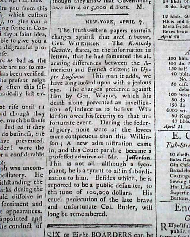 The back page has an article concerning General Wilkinson, stating: "...that he had fomented the alarming differences between the American and French citizens in Upper Louisianas...".