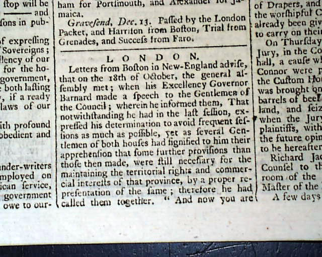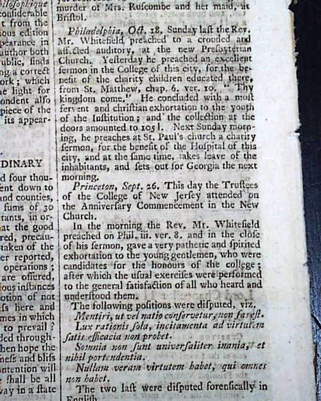 Also news from Boston as well. And the back page has a report from Philadelphia that the Rev. Mr. Whitefield: "...preached to a crowded and affected auditory at the new Presbyterian Church. Yesterday he preached an excellent sermon in the College of this city...He concluded with a most fervent & Christian exhortation to the youth of the institution...". And then a note from Princeton that the Trustees attended the anniversary commencement in the new church.