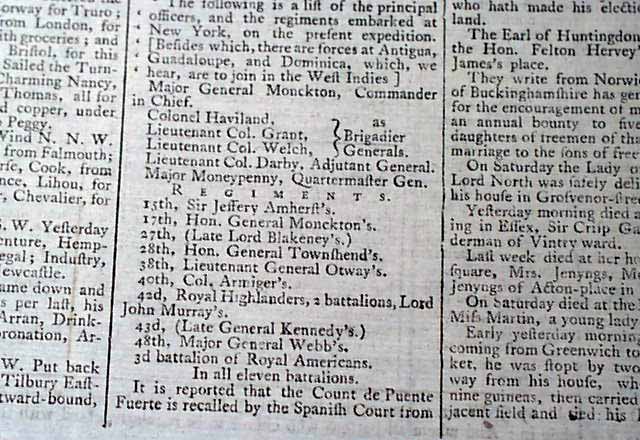 Page 7 has reports from New York newspapers with the latest news concerning the French & Indian War, and includes: "...a list of the principal officers & the regiments embarked at New York on the present expedition...".