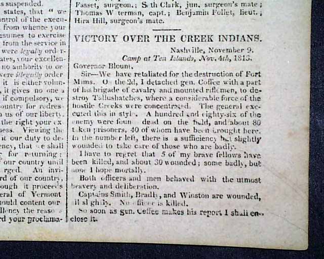 The front page begins with: "A Proclamation" by the governor of Vermont. The front page also has: "Victory Over The Creek Indians" which begins: "We have retaliated for the destruction of Fort Mims..." with more, signed in type by: Andrew Jackson, carrying over to page 2.