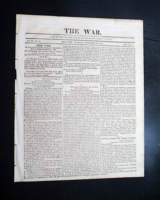 background: What makes THE WAR particularly exceptional is its commitment to being a primary source record rather than a mere local rag; by eschewing advertisements, it functioned more like a curated military gazette, capturing the raw tension of 1813 when the American war effort was simultaneously finding its footing in the South and stumbling in the North. This November 30th issue is a masterpiece of historical irony, juxtaposing the brutal efficiency of Andrew Jackson and John Coffee during the Creek War—specifically the "retaliation" for Fort Mims at the Battle of Tallushatchee—against the bureaucratic and strategic collapse of the St. Lawrence campaign. While the dispatches from Jackson signal the emergence of a future president through decisive (and controversial) military action, the extensive "Official Correspondence" of General James Wilkinson on the back pages serves as a real-time post-mortem of the failed invasion of Montreal. Reading the accounts of Crysler’s Farm and the friction between Wilkinson and Wade Hampton provides a rare, unvarnished look at the logistical nightmares and command failures that defined the Canadian frontier, all preserved in a clean, quarto-sized format designed specifically for the archives of history.