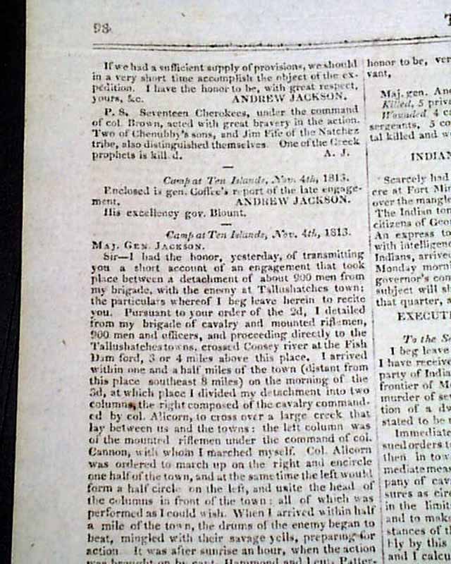 Inside has a detailed letter from John Coffee, prefaced by a note signed: Andrew Jackson, which is a fine account of the Battle of Tallushatchee.
