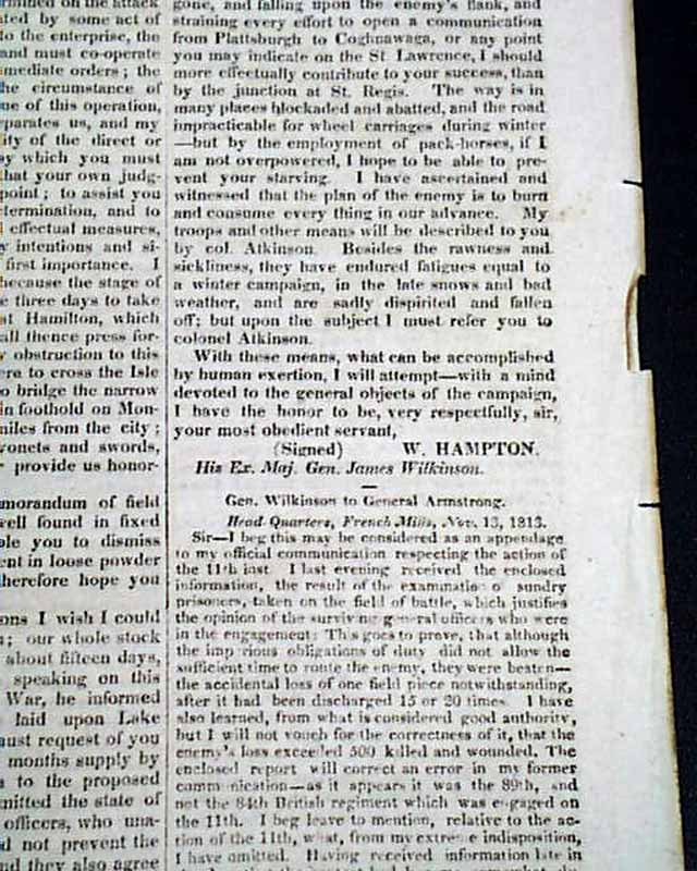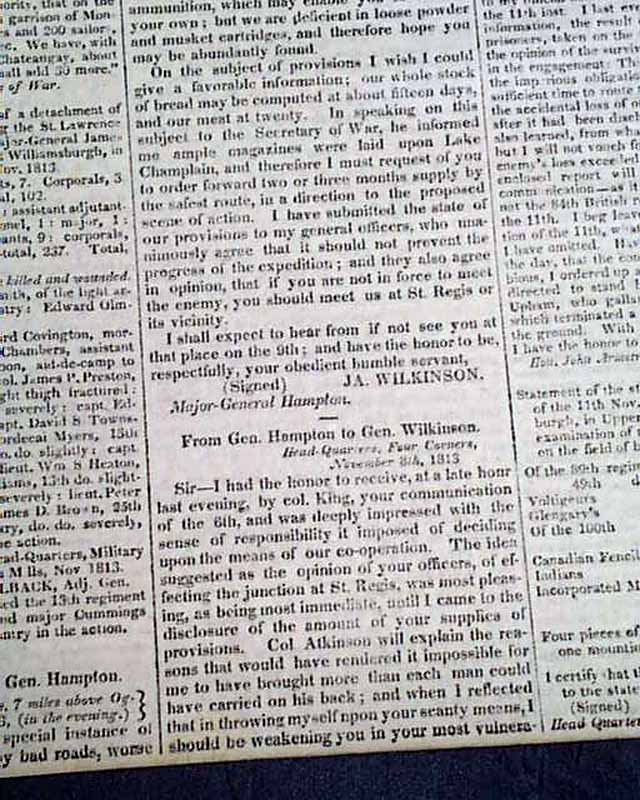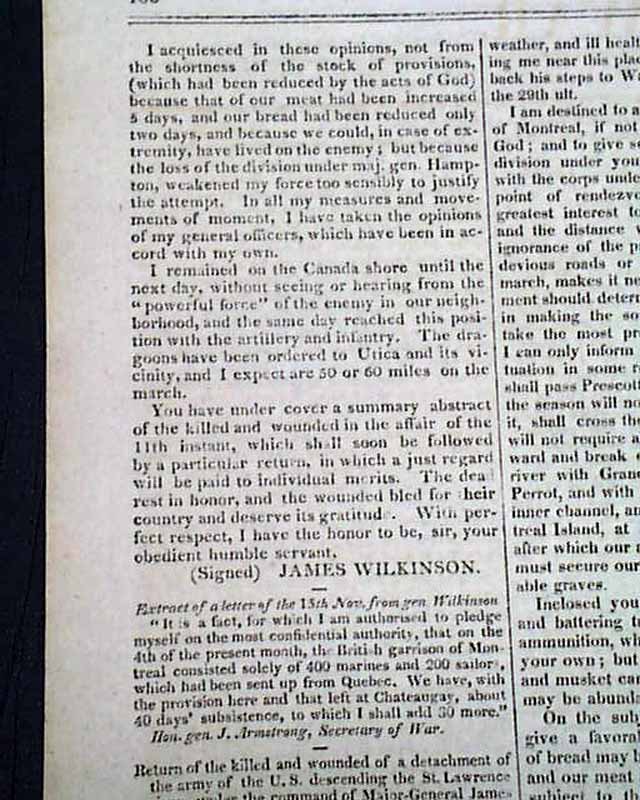 Of special note is: "Official Correspondence from Gen Wilkinson to the Secretary of War" which takes all of page 3 and part of page 4. This is a very detailed account of Wilkinson's campaign on the St. Lawrence River, part of a plan for an attack on Montreal by an American force from Sackets Harbor, under Wilkinson's command, in concert with the forces of General Wade Hampton. The offensive failed when Hampton canceled the advance of his command following the battle of Chateauguay and the defeat of Wilkinson's army at the Battle of Crysler's Farm.