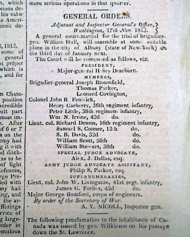 Beginning the court martial of General Hull... Victory over the Indians...