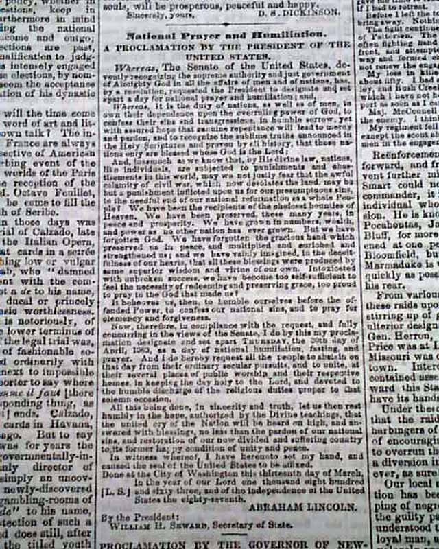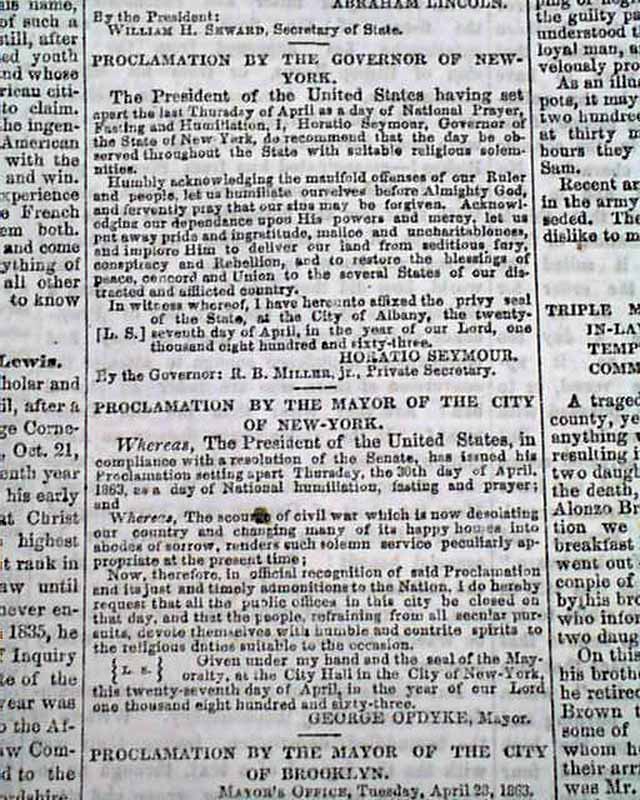NEW YORK TRIBUNE, April 30, 1863  Page 3 contains a very notable Proclamation by Lincoln headed: "National Prayer and Humiliation. A Proclamation by the President of the United States" which contains the full text for the National Day of Fasting, Humiliation, and Prayer.