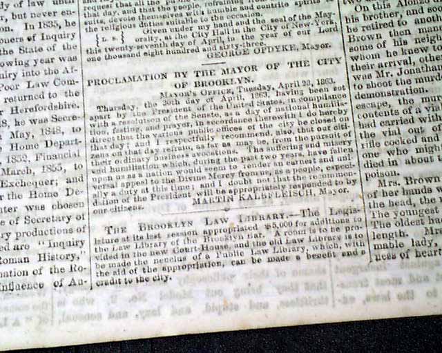 Following Lincoln's proclamation are similar proclamations by the Governor of New York, the mayor of New York City, and the Mayor of Brooklyn, as well as an additional lengthy article in response to the proclamation.