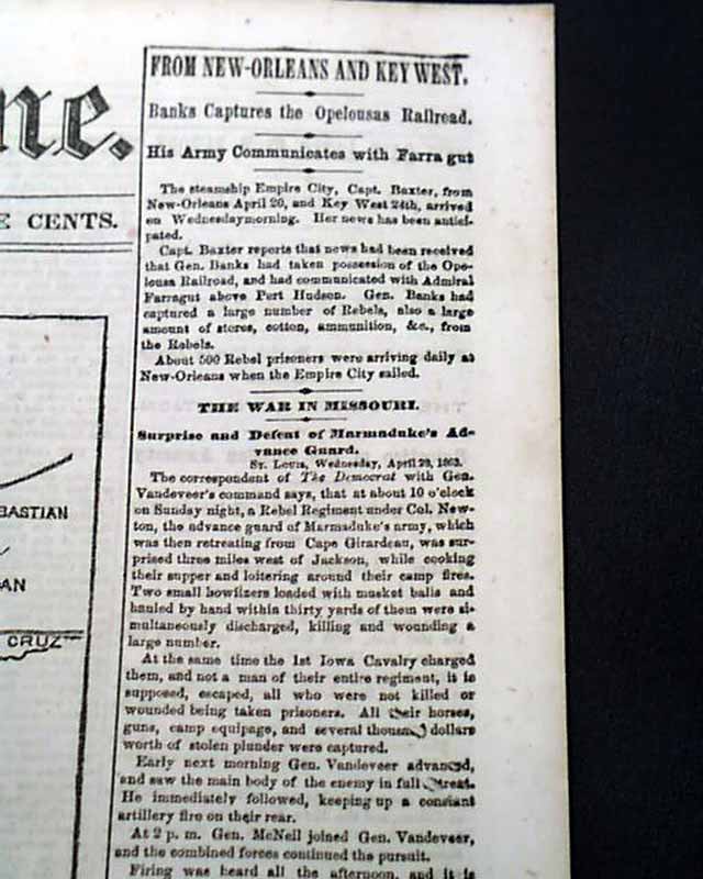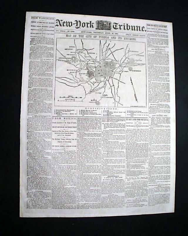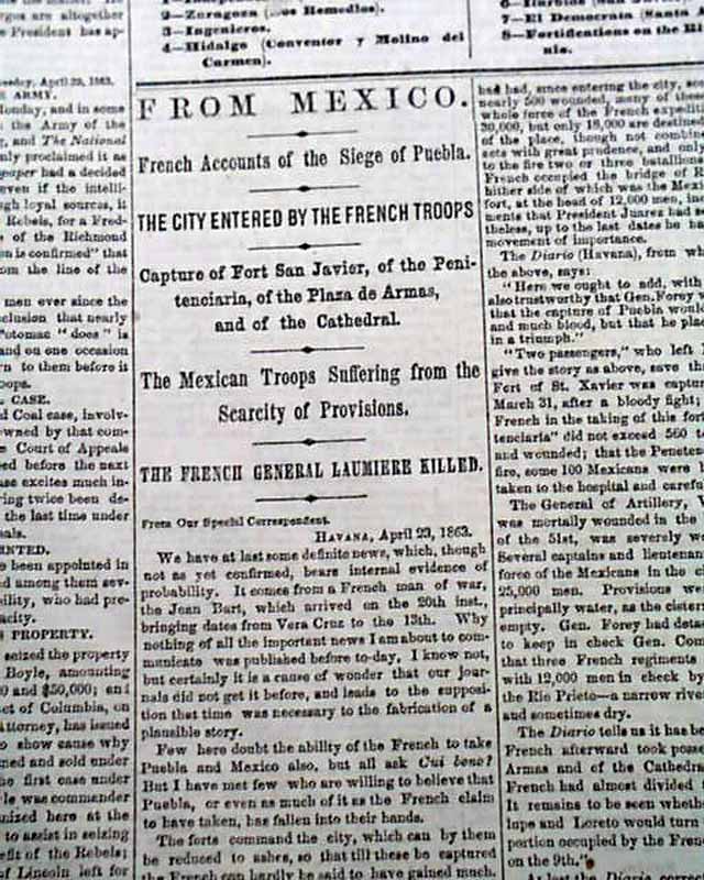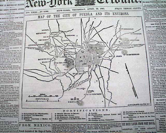 Additionally, the front features a nice & very detailed map headed: "Map Of The City of Puebla And Its Environs" with a key as to the principal buildings, etc. The front page has related heads and reports on the Civil War, with: "From Mexico" "French Accounts of the Siege of Puebla" "The City Entered by the French Troops" "From New Orleans & Key West" "Banks Captures the Opelousas Railroad" "From Washington" "Payment Of Mustered Out Soldiers" "General Banks's Successful Advance" and more. More war content inside as well.