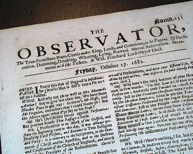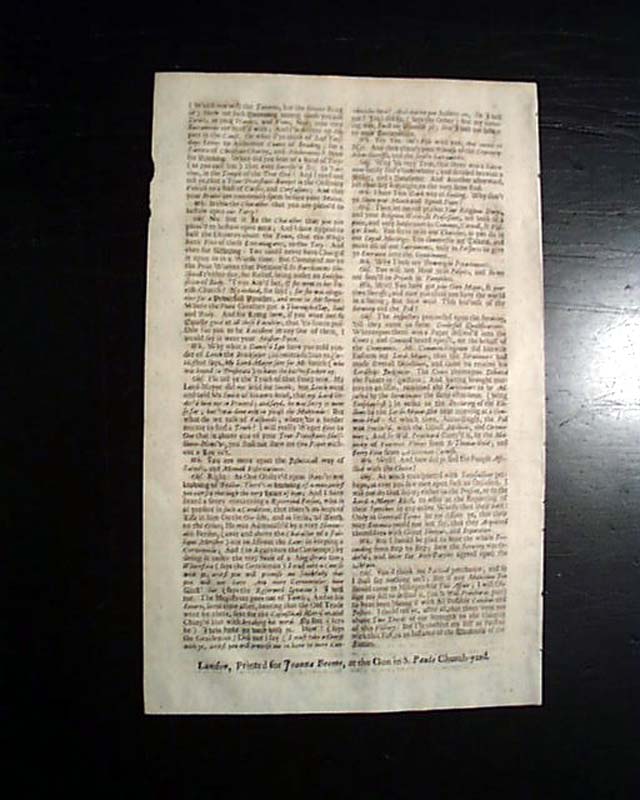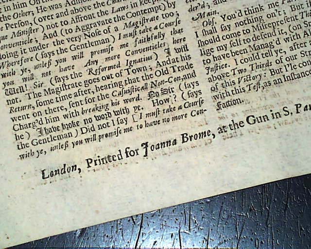 This is a handsome dialogue newspaper founded by Sir Roger L'Estrange, a Tory pamphleteer, as a vehicle for attacking dissenters and Whigs. Done in a dialogue format, between Whig & Tory. This early single sheet newspaper has the old style type making it great for framing, but the most intriguing aspect of this issue is that the imprint at the bottom of the back page reads: "London, Printed for Joanna Brome, at the Gun in S. Paul's Church-yard."