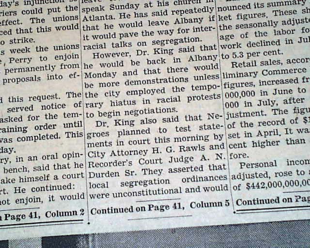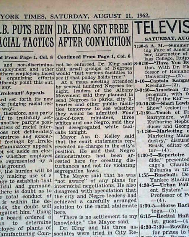 wikipedia notes: The Albany Movement was a desegregation coalition formed in Albany, Georgia in November, 1961. In December King and the SCLC became involved. The movement mobilized thousands of citizens for a broad-front nonviolent attack on every aspect of segregation within the city and attracted nationwide attention. When King first visited on December 15, 1961, he "had planned to stay a day or so and return home after giving counsel." But the following day he was swept up in a mass arrest of peaceful demonstrators, and he declined bail until the city made concessions. "Those agreements", said King, "were dishonored and violated by the city," as soon as he left town. King returned in July 1962, and was sentenced to forty-five days in jail or a $178 fine. He chose jail. Three days into his sentence, Chief Pritchett discreetly arranged for King's fine to be paid and ordered his release. "We had witnessed persons being kicked off lunch counter stools ... ejected from churches ... and thrown into jail ... But for the first time, we witnessed being kicked out of jail."