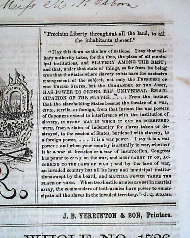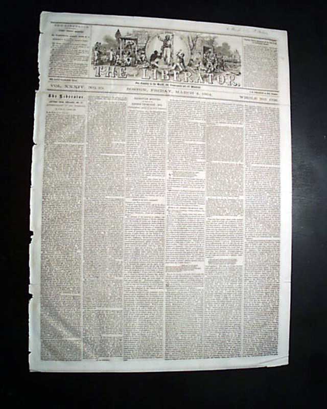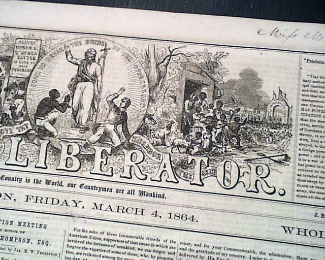This is the famous anti-slavery newspaper by William Lloyd Garrison, which features a very decorative and slave-themed masthead which shows a scene of slaves being auctioned, and a scene of slaves being liberated.
