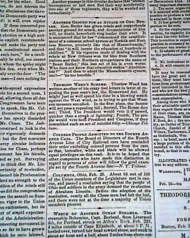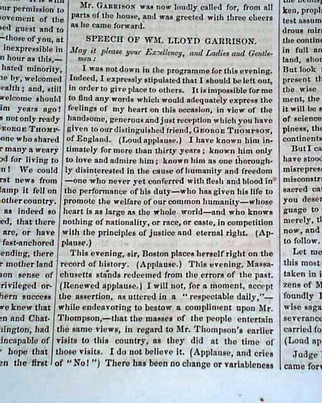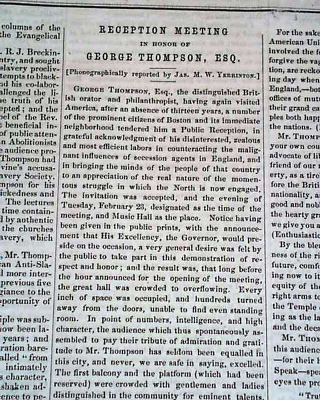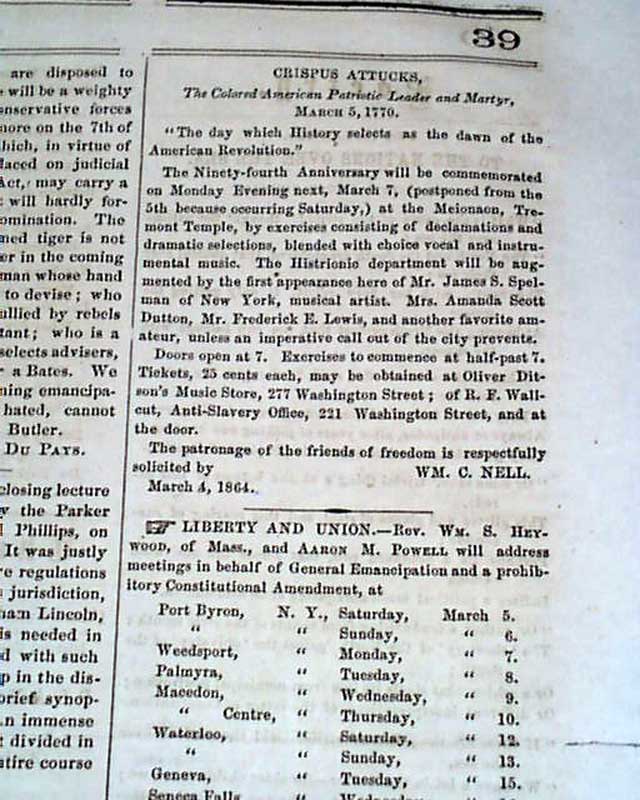 Articles within include: "Speech of Wm. Lloyd Garrison" at the reception for Mr. George Thompson, the famed anti-slavery orator. The top of page 3 has a nice item on: "Crispus Attucks, The Colored American Patriotic Leader and Martyr, March 5, 1770". Attucks, an African-American, was one of the five men killed at the Boston Massacre.