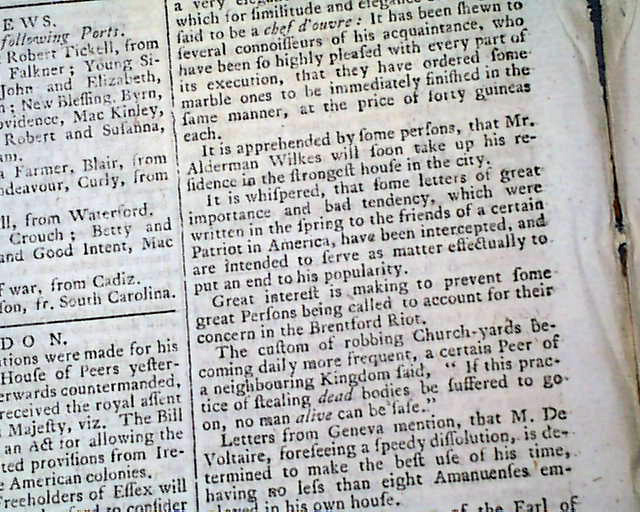 Page 2 has an interesting report: "It is whispered, that some letters of great importance and bad tendency, which were written in the spring to the friends of a certain Patriot in America, have been intercepted, and are intended to serve as matter effectually to put an end to his popularity."