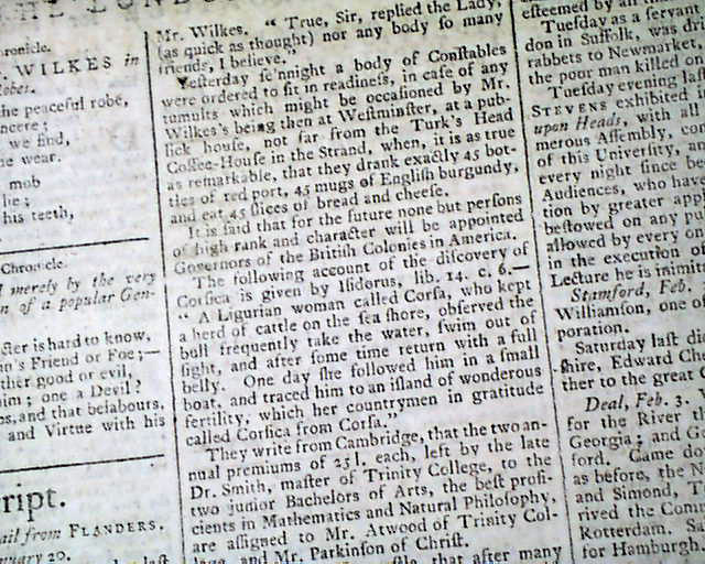 The back page has a small bit: "It is said that for the future none but persons of high rank and character will be appointed Governors of the British Colonies in America."