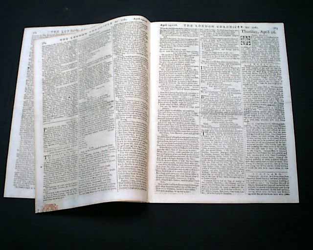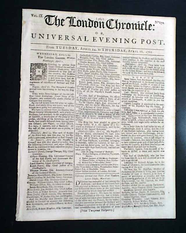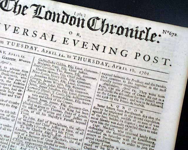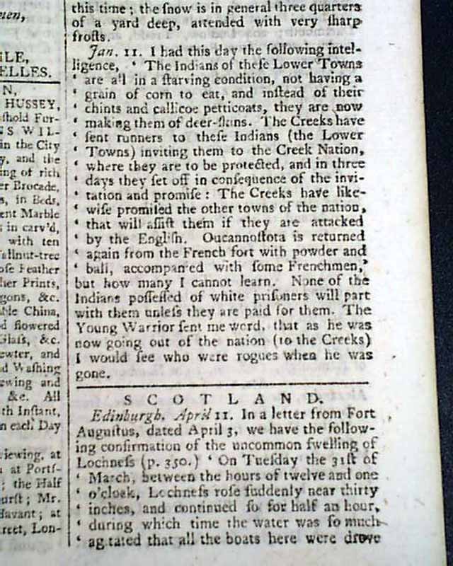 THE LONDON CHRONICLE, England, April 16, 1761 Page 5 has over half a column headed: "America" with datelines from Charleston and Fort Prince George. The former notes: "...from Augusta...received...say that our firm friend the old Wolf King of Moculasse, in the Creek Nation, had been there for some time & was preparing to set out for Savannah to see Gov. Wright...".