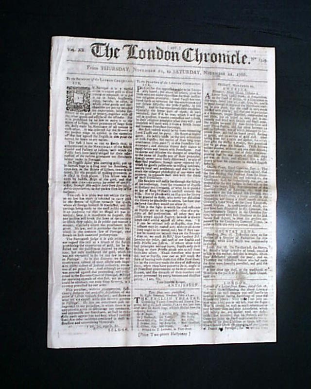 THE LONDON CHRONICLE, England, Nov. 22, 1766  The front page has over half a column of news headed: "America" which includes problems with pirates: "...to acquaint the merchants trading to this place that the coast is very much infested with pirates; and that one in particular is a schooner, copper-sheathed, commanded by one Hide, has on board 34 men...She cruises between the river Settra-Crue and cape Three Points and has taken between 12 and 14 shalloops, [shallops: vessels used for sailing in shallow waters, especially a two-masted, gaff-rigged vessel of the 17th and 18th centuries] one of which belonged to Governor Brew..." with more.