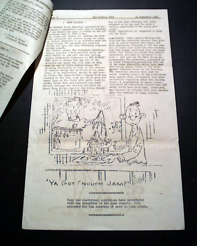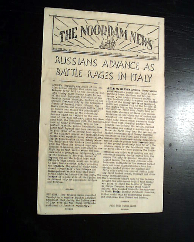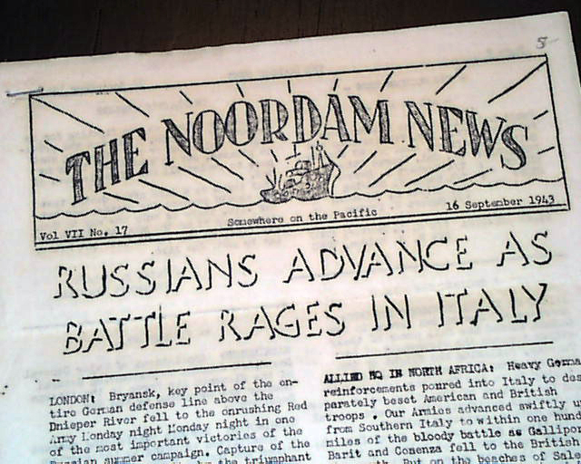 THE NOORDAM NEWS, "Somewhere on the Pacific", Sept. 16, 1943 The Noordam was a Holland American Line ship which was converted to a troopship by Bethlehem Steel to transport up to 2,400 troops for the U.S. War Shipping Administration. She was sent into action and transporting troops where needed.
