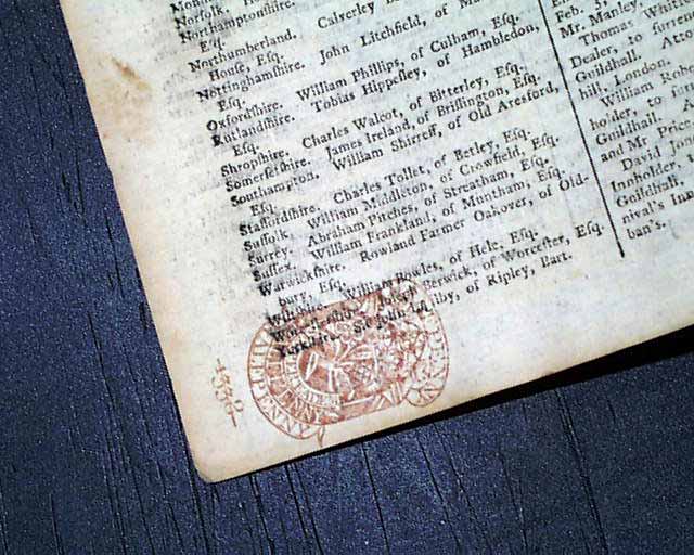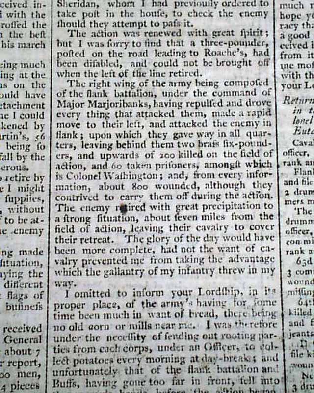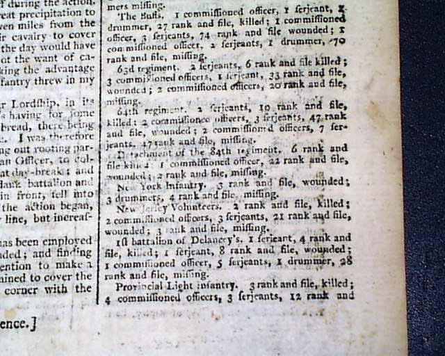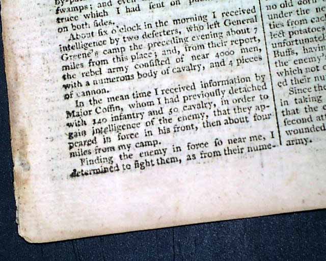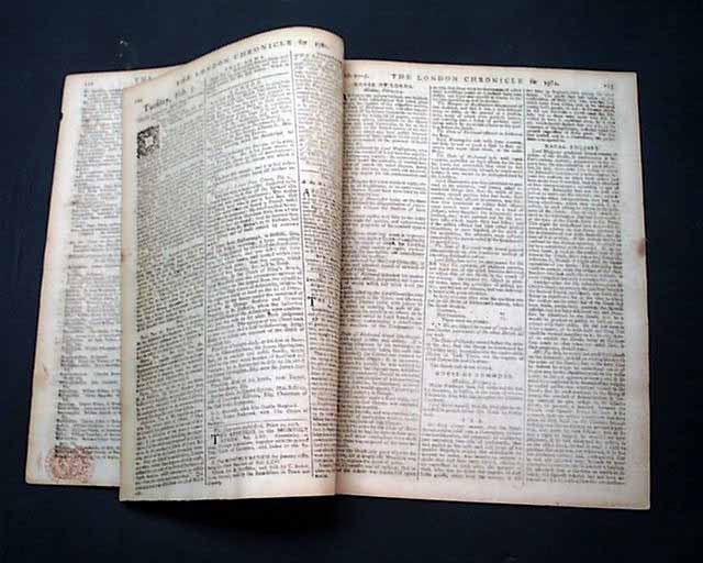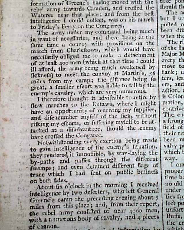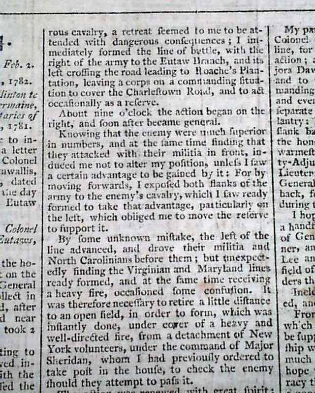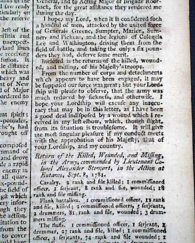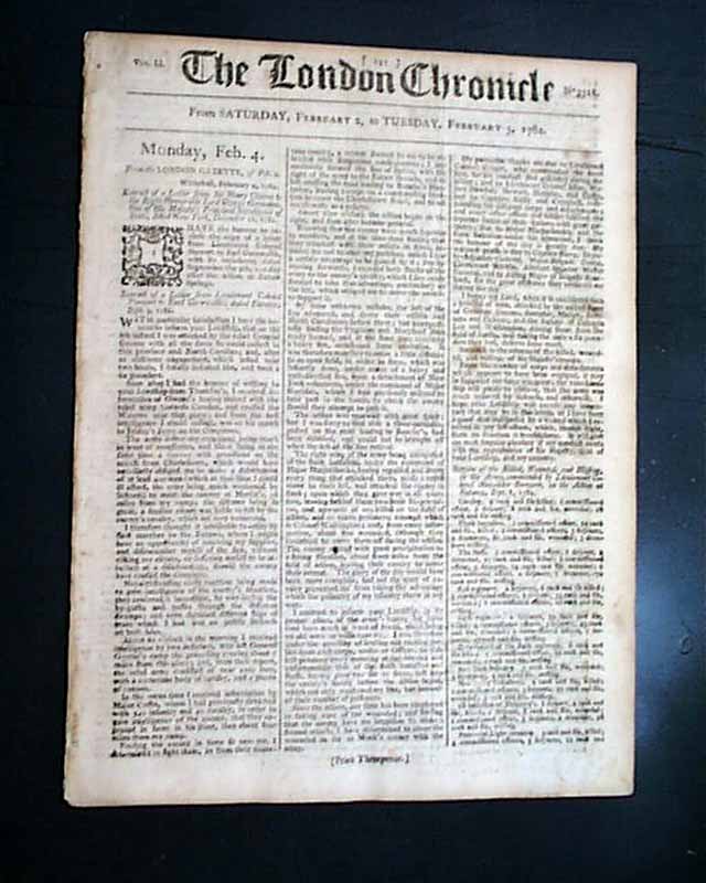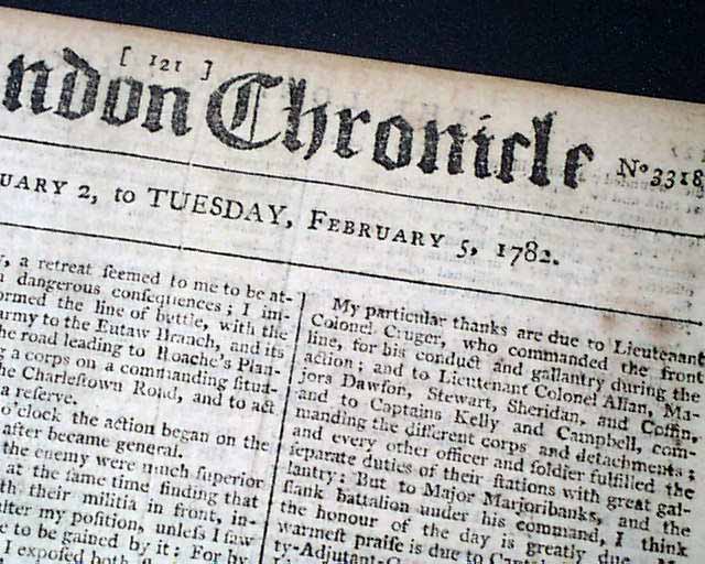 THE LONDON CHRONICLE, England, Feb. 5, 1782 A terrific issue as the entire front page is taken up with a great report on the historic Battle of Eutaw Springs, being the account of a letter from Lt. Col. Stewart to Earl Cornwallis dated the day after the battle. Included is the "Return of the Killed, Wounded, and Missing...". In this battle the American General Greene was defeated was the British, but the action forced the British back to Charleston giving the Americans control of most of South Carolina.