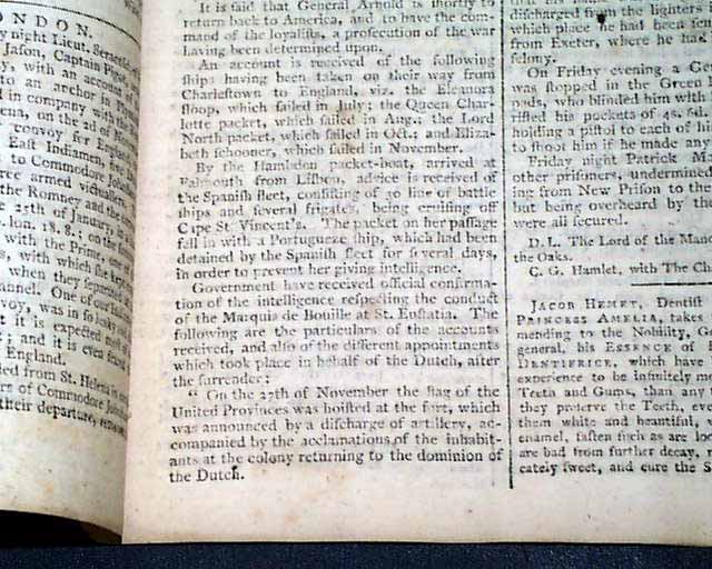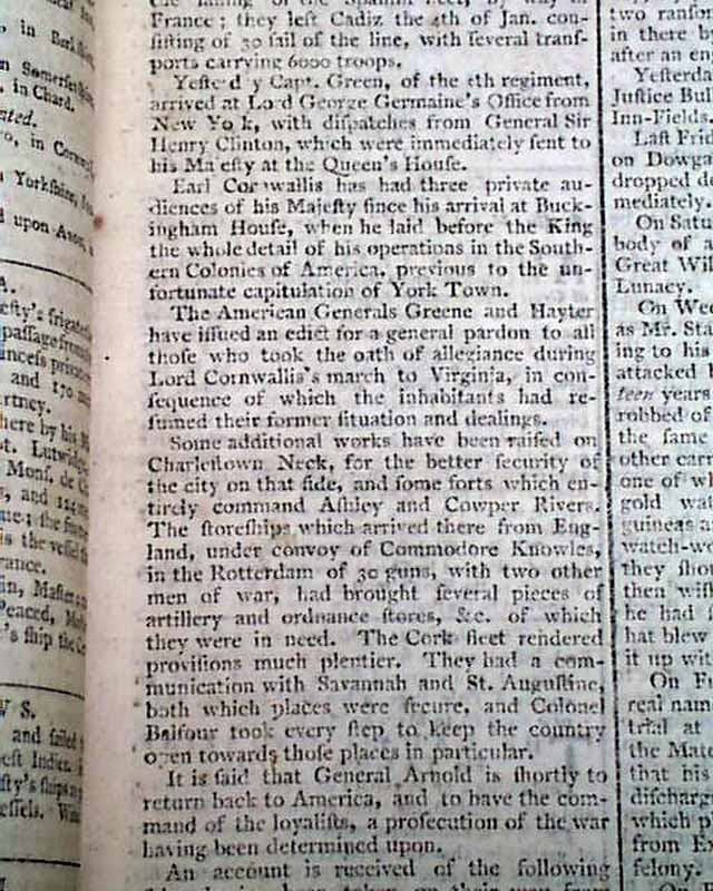 Inside has more on the war, a few bits including: "...Earl Cornwallis...the whole details of his operations in the southern colonies of America, previous to the unfortunate capitulation of York Town. The American Generals Greene & Hayter have issued an edict for a general pardon to all those who took the oath of allegiance during Lord Cornwallis' march to Virginia...It is said that General Arnold is shortly to return back to America & to have the command of the loyalists..." and more.