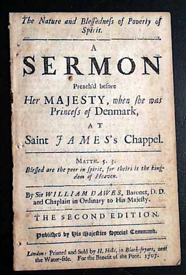 London pamphlet from 1707. The full title page notes in part: "A SERMON Preach'd before Her MAJESTY, when she was Princess of Denmark, at Saint James's Chapel" with more, the second edition, London, 1707.