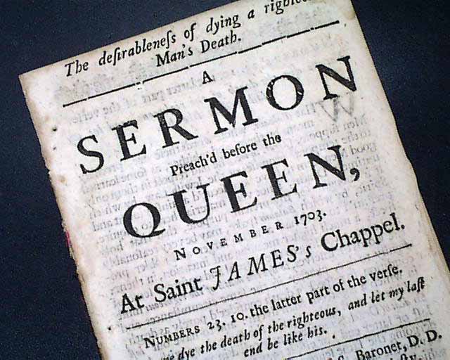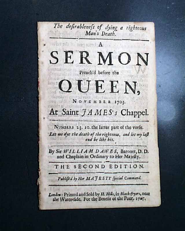London pamphlet from 1707. The full title page notes in part: "A SERMON Preach'd before the QUEEN, November 1703. At Saint James's Chappel" with more, the second edition, London, 1707.