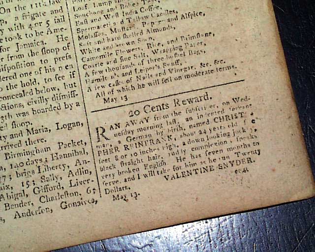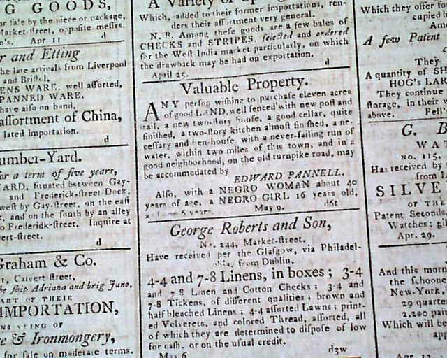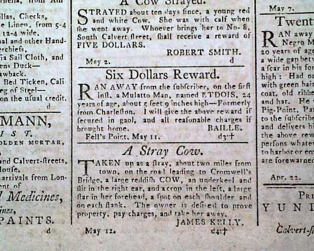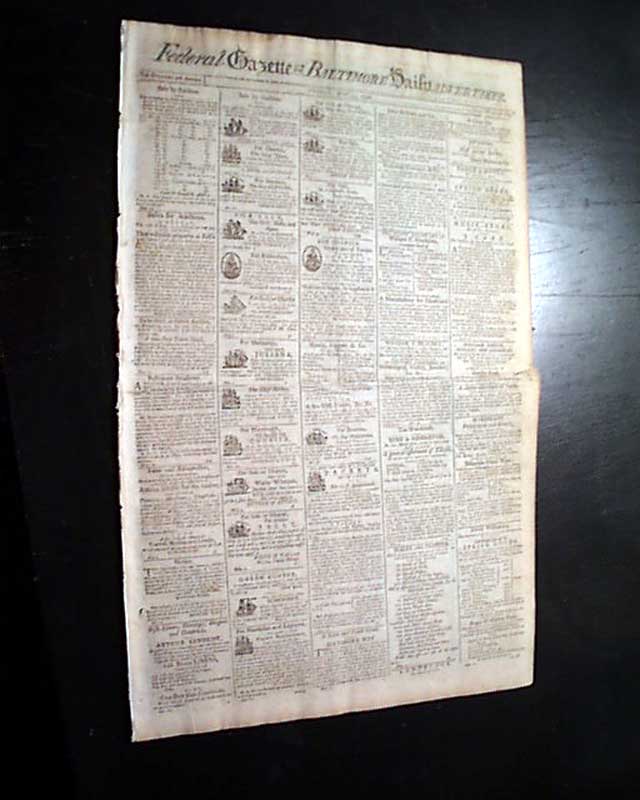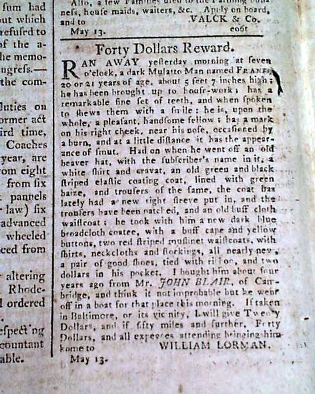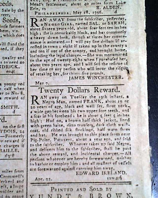 FEDERAL GAZETTE & BALTIMORE DAILY ADVERTISER, May 13, 1796 The front page is taken up with ads including 19 illustrated ship ads. There are no fewer than five runaway "Reward" ads, all with various detail.