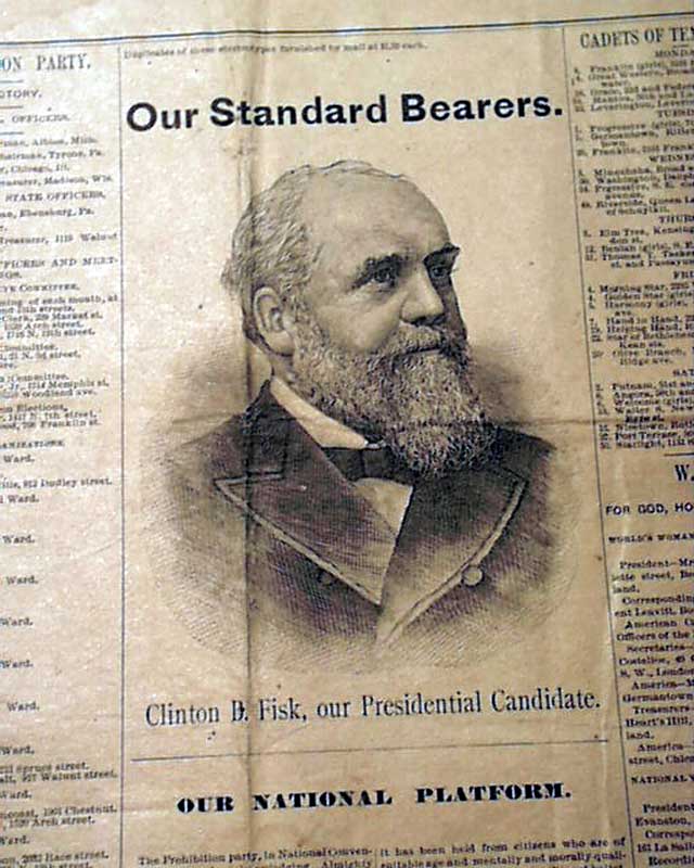THE QUILL, Philadelphia, Aug. 4, 1888 This is a rare prohibition-focused newspaper, but also has a strong political focus with page 3 featuring large prints of; "Our Standard Bearers - Clinton B. Fish, our Presidential Candidate" and: "Dr. John A. Brooks, for Vice-President". Between their prints is: "Our National Platform".