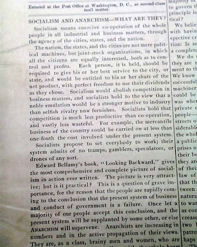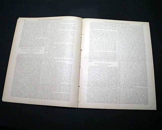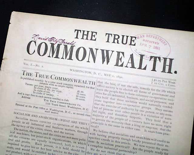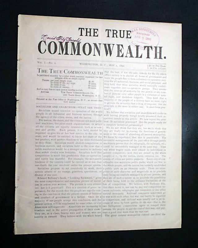 THE TRUE COMMONWEALTH, Washington, D.C., May 1, 1890 This is the volume 1, number 2 issue of a space title. This is a monthly publication, and as explained on the back page it: "...demands that all interstate railways, telegraphs, etc., shall be owned & operated by the General Government in the interest of the whole people; that local railway and telegraph lines shall be owned & operated by the States in which they begin & terminate, & that the various cities shall own & run all water works, gas works, telephone lines, street railways, elevated railways, etc...".
