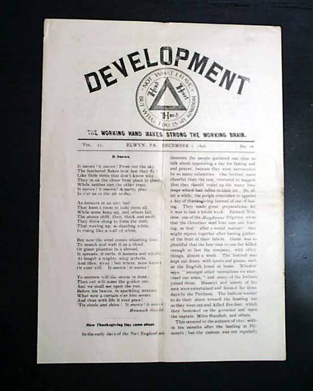 DEVELOPMENT, Elwyn, Pennsylvania, Dec. 1, 1898 A very curious little publication, noted in the masthead is: "The Working Hand Makes Strong The Working Brain". And the logo in the masthead includes: "Not What I have - But What I do, is My Kingdom".