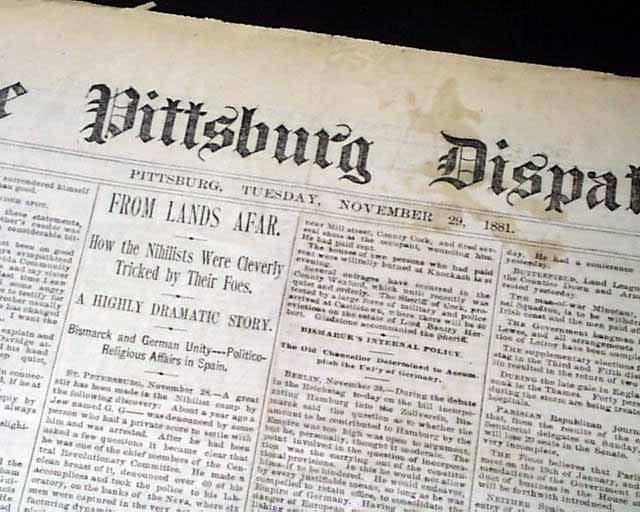 THE PITTSBURG DISPATCH, Pennsylvania, Nov. 29, 1881  This famous city has had a troubled history with (or without) the "h" in its name. From the earliest years it was spelled "Pittsburgh", but then in 1891 it was formally changed to "Pittsburg" but then again would add the "h" to give us the "Pittsburgh" we know today.
