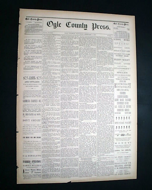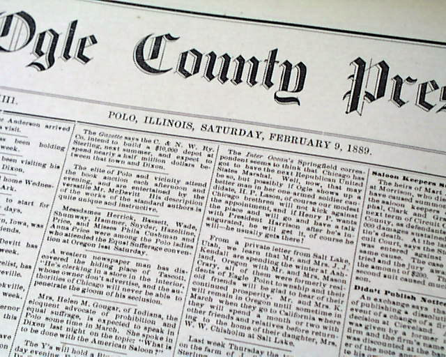 OGLE COUNTY PRESS, Polo, Illinois, Feb. 9, 1889 A typical newspaper of the day from this Northern Illinois town of 2355.