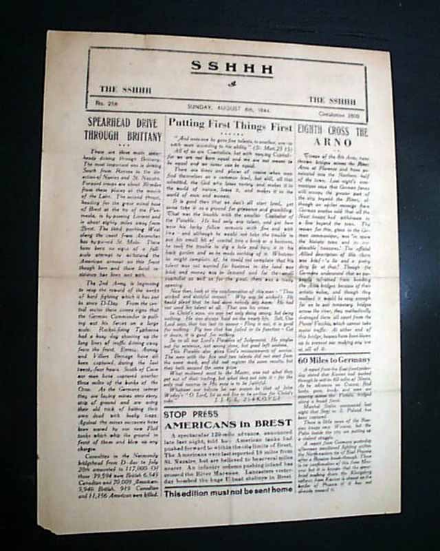 SSHHH, August 6, 1944 An interesting title for sure, being a single sheet military paper reporting on recent battle reports. The newsiest purposely has no city of publication, but was presumably published somewhere in Europe, two months after D-Day.