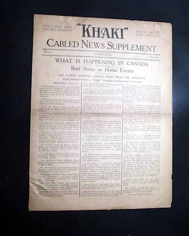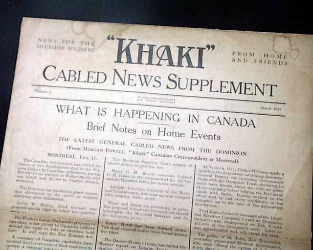 KHAKI, CABLED NEWS SUPPLEMENT, London, March, 1915 A masthead includes: "News For The Overseas Soldiers From Home And Friends" during the early period of World War I, before America's involvement. This is the "Number 1" issue.