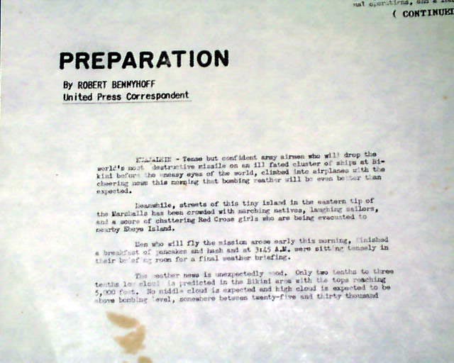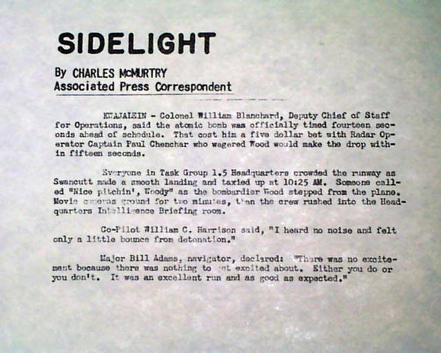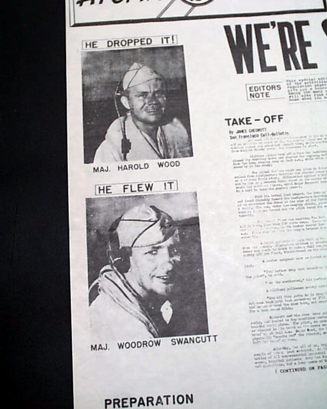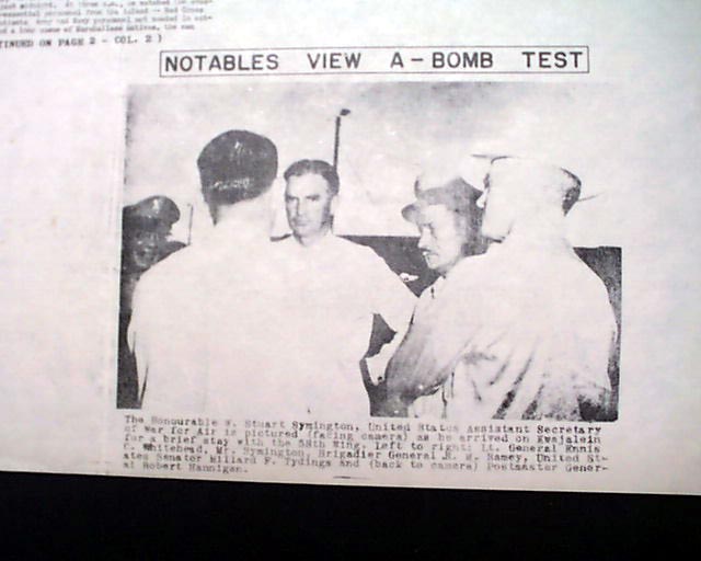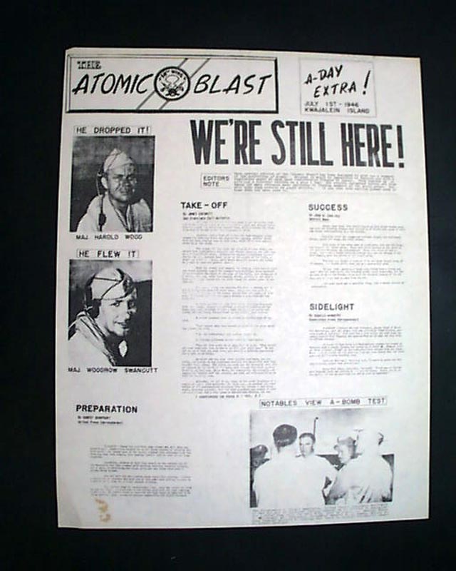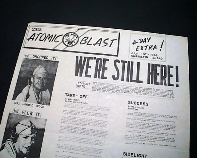 This "newspaper" was printed in nearby Kwajalein Islands, with the headline noting: "WE'RE STILL HERE ! " after the blast. Photos include the man who "Dropped It" and the man who "Flew It" as well as: "Notables View A-Bomb Test".