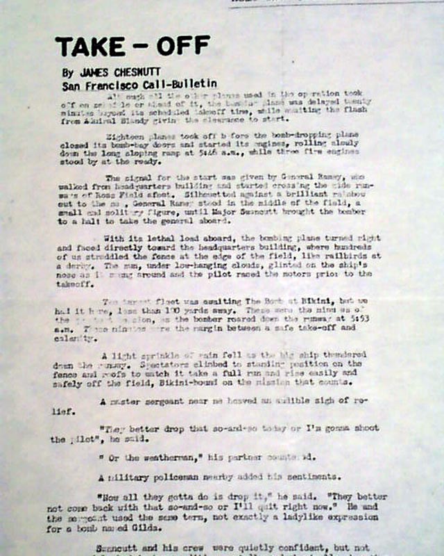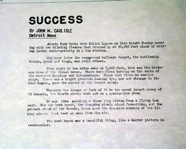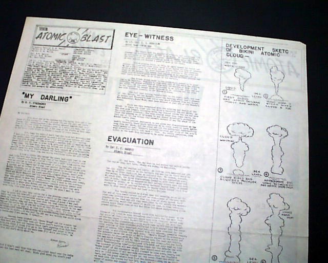 The "Editors Note" begins: "This special edition of the 'Atomic Blast' has been designed to give you a summary of the activities of A-Day. Because it would be impossible to furnish you with a regulation paper we have used considerable freedom in layout. This enables us to give you a souvenir edition on A Plus 1 Day...".  The back page is very descriptive as well.