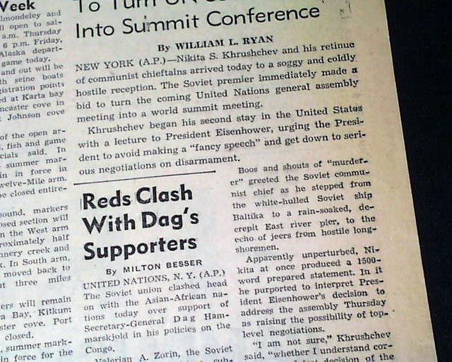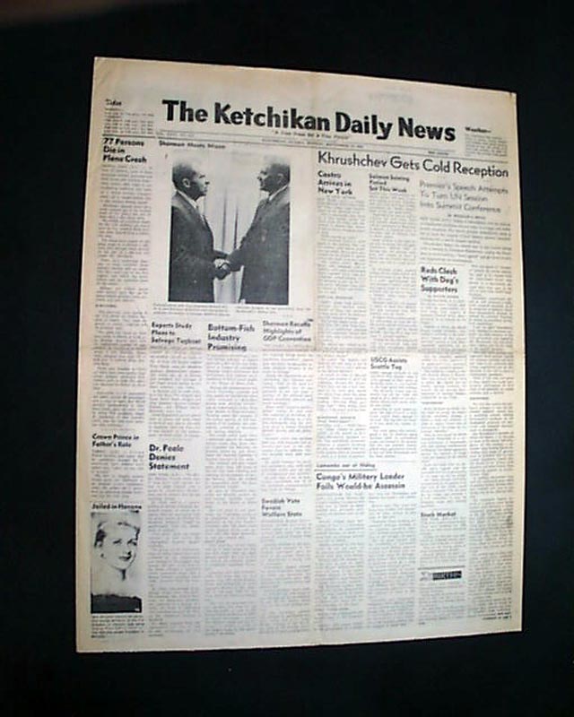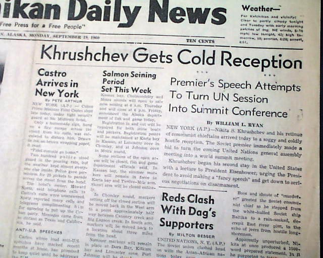 THE KETCHIKAN DAILY NEWS, Alaska, Sept. 19, 1960  The front page reports Khrushchev's arrival in New York to attend a United Nations session: "Khrushchev Gets Cold Reception" with more.