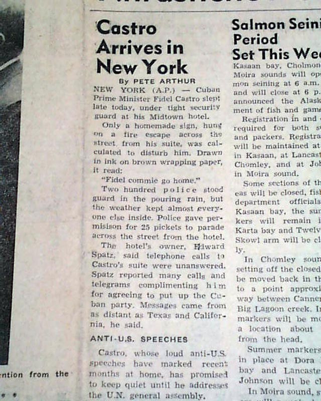 Also on the front page: "Castro Arrives in New York" and a photo of Mrs. Marjorie Lennox, a secretary at the U.S. Embassy in Havana, Cuba, headed: "Jailed in Havana".