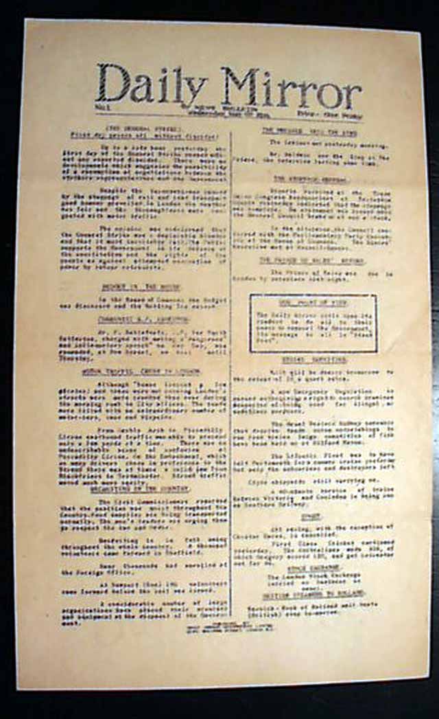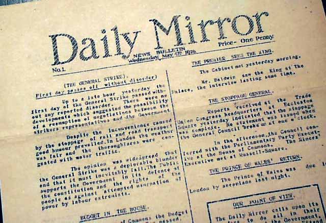 background: During the 1926 United Kingdom general strike (3–12 May 1926), the Daily Mirror—already a leading national tabloid—faced major disruption in publishing yet managed to appear in emergency form (for example 12 May 1926) despite industrial breakdown. In its editorial commentary it struck a critical tone toward the strike movement, describing the action of the workers as being “led … to take part in this attempt to stab the nation in the back by a subtle appeal to the motives of idealism in them.” Spartacus Educational. Thus the Mirror sided with the establishment‑view of the strike as a threat to national stability, rather than aligning with the sympathetic labour perspective.