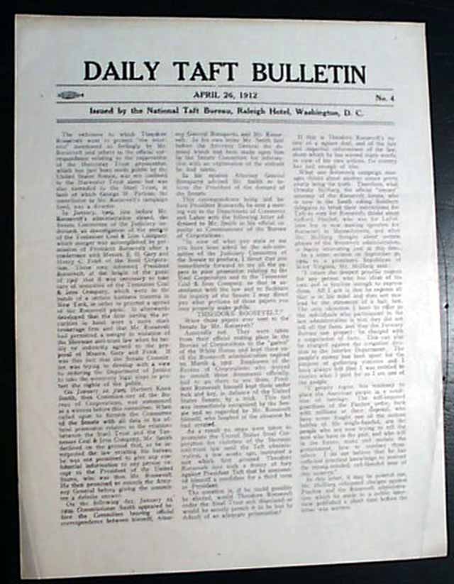 In the masthead below the dateline is: "Issued by the National Taft Bureau, Raleigh Hotel, Washington. D. C." This is the number 4 issue.