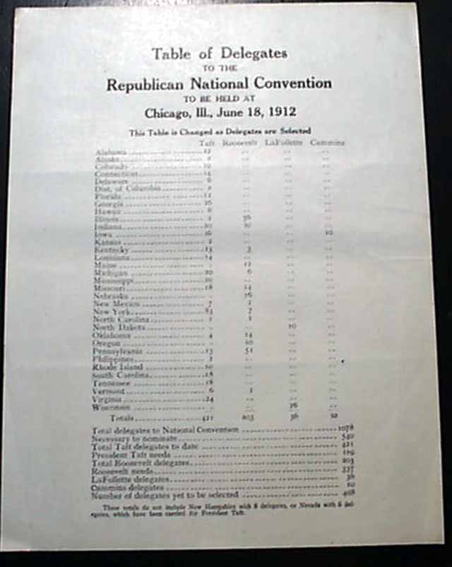 A single sheet with the reverse taken up with a "Table of Delegates To The Republican National Convention To be Held At Chicago, Ill., June 18, 1912. This Table is Changed as Delegates are Selected" presented in broadside format.