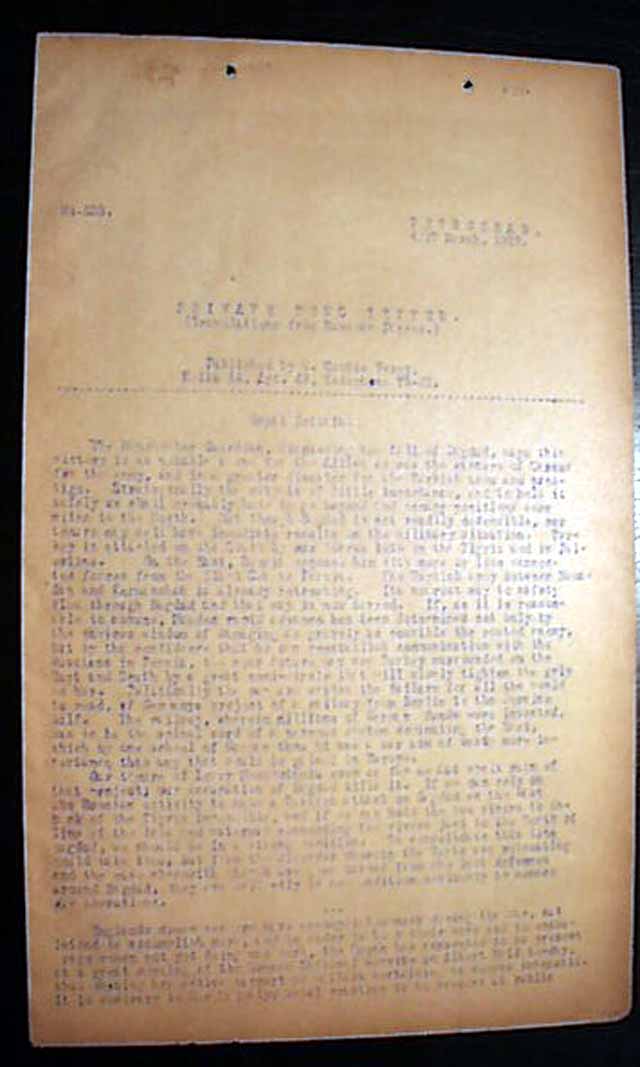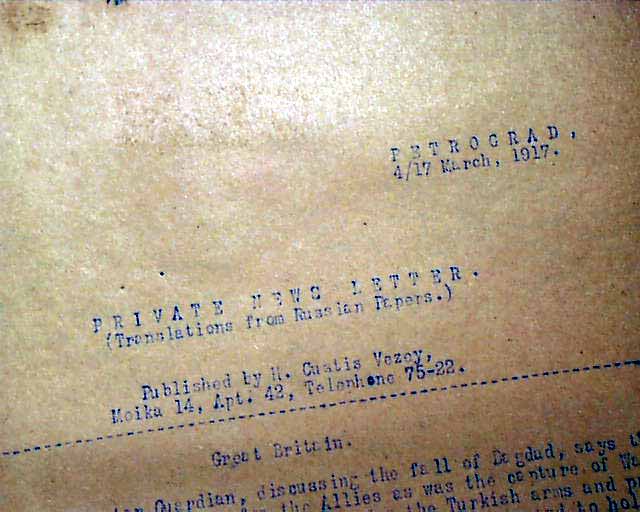 PRIVATE NEWS LETTER, Petrograd (today St. Petersburg, Russia), March 17, 1917 Noted under the title is "(Translations from Russian Papers)". This is a very rare "newspaper", typewriter-set on four individual sheets, reproduced on a mimeograph machine on one side only