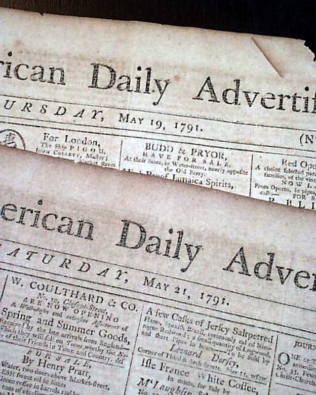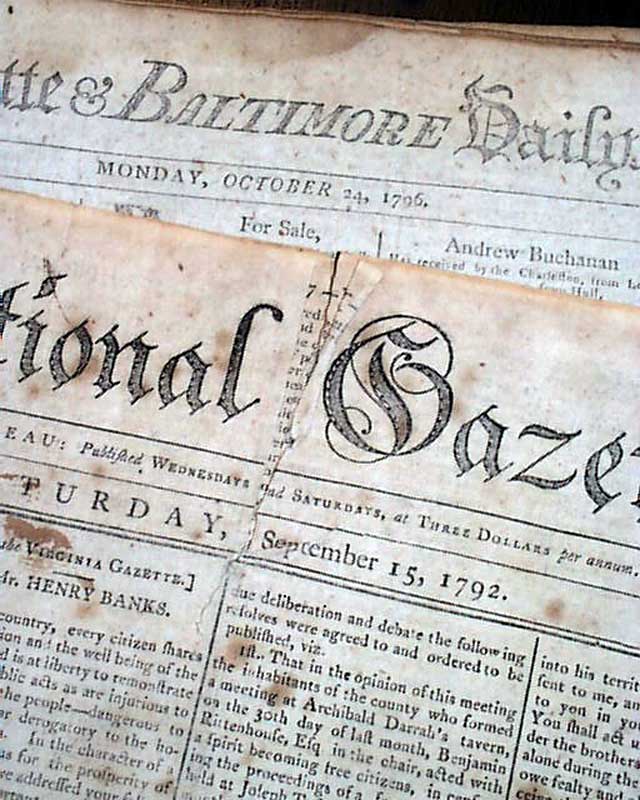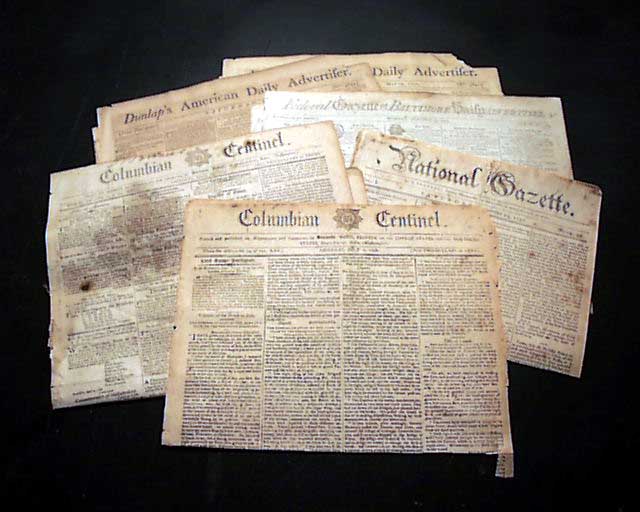 A lot of six issues of American newspapers of the 1790's: Columbian Centinel (Boston), July 2, 1796; same, April 23, 1796; Dunlap's American Daily Advertiser, May 19, 1791; same, May 21, 1791; Federal Gazette & Baltimore Daily Advertiser, Oct. 24, 1796; and National Gazette (Phila.), Sept. 15, 1792.