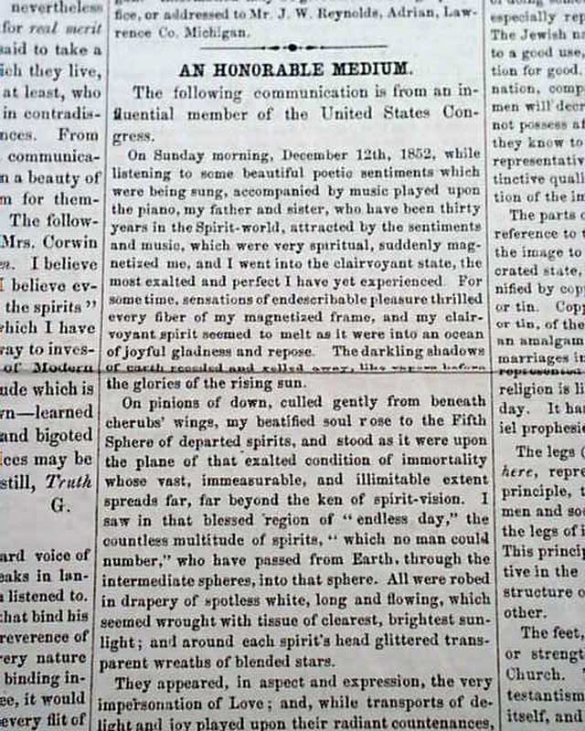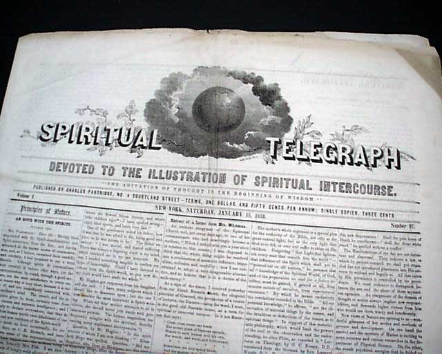 AI notes: The Spiritual Telegraph was a weekly New York City newspaper founded in 1852 that became one of the earliest and most influential journals of the American Spiritualist movement, devoted to reporting on spirit communication, séances, and the activities of mediums. Initially published by Charles Partridge, it sought to document and investigate spiritual phenomena with a combination of news, personal accounts, and philosophical commentary, reflecting the growing public fascination with life after death in mid-19th-century America. In 1858, the paper expanded its scope and was renamed Spiritual Telegraph and Fireside Preacher, blending Spiritualist reporting with broader religious and moral commentary, though it remained committed to chronicling spirit manifestations and experiences. The publication ceased in 1860, but its impact persisted as its readership and subscription lists were absorbed by other Spiritualist journals such as the Herald of Progress, and its issues remain a valuable historical source for understanding the early Spiritualist movement and its cultural context in antebellum New York.