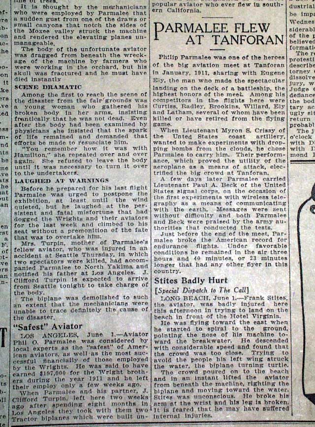 The front page has the 2-line, 2-coumn heading: "Death Rides With Parmalee - Aviator Meets a Tragic End", with is followed an article headed: "America's 'Safest' Air Navigator Crushed Under Machine, Overturned by Gust", followed by text which continues on an inside page. The front page also has a large, related photo.