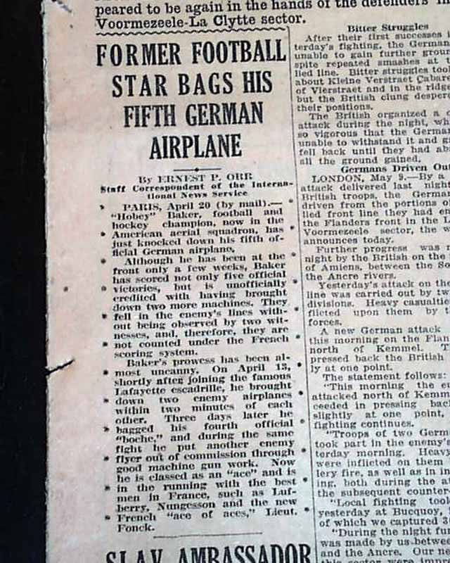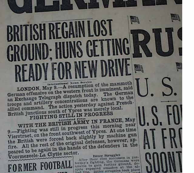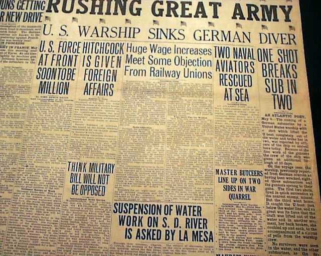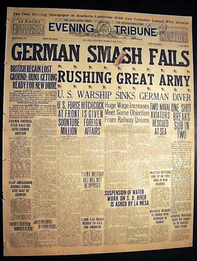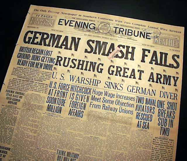 EVENING TRIBUNE, San Diego, California, May 9, 1918 Banner headline on World War I: "GERMAN SMASH FAILS" plus also: "Rushing Great Army" "U. S. WARSHIP SINKS GERMAN DIVER" "One Shot Breaks Sub In Two" "British Regain Lost Ground; Huns Getting Ready For New Drive" and more;