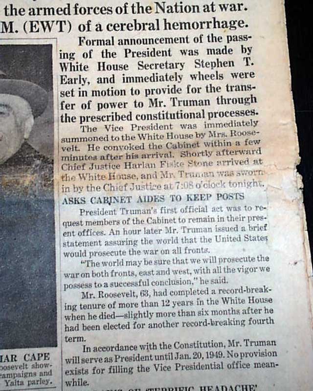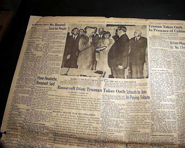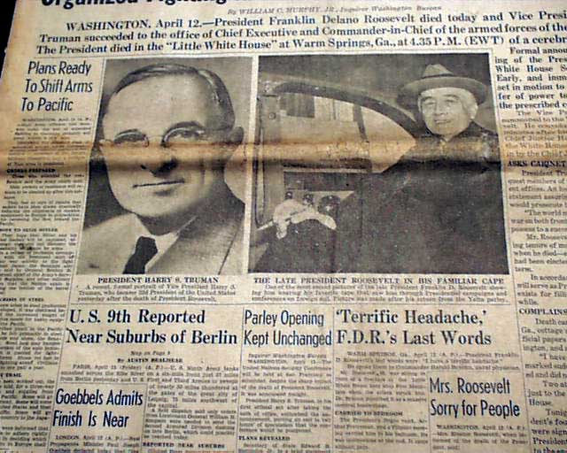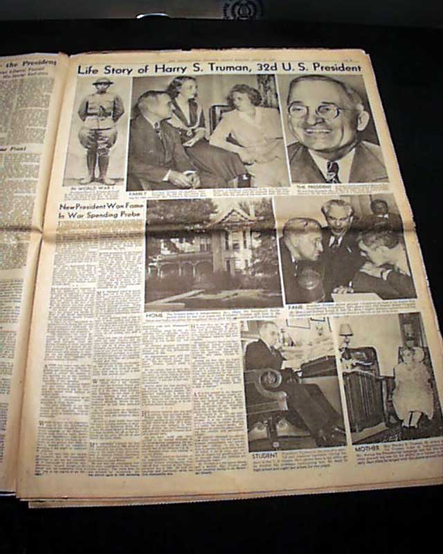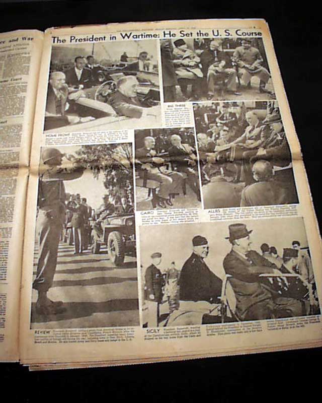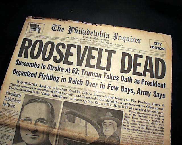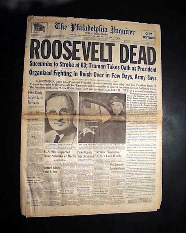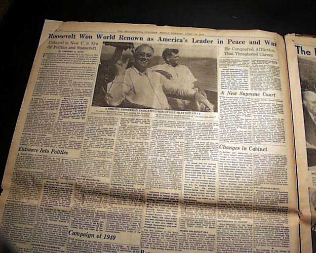 The front page has a nice banner headline that announces: "ROOSEVELT DEAD" with subheads and photo. Much more inside. Nice for display.