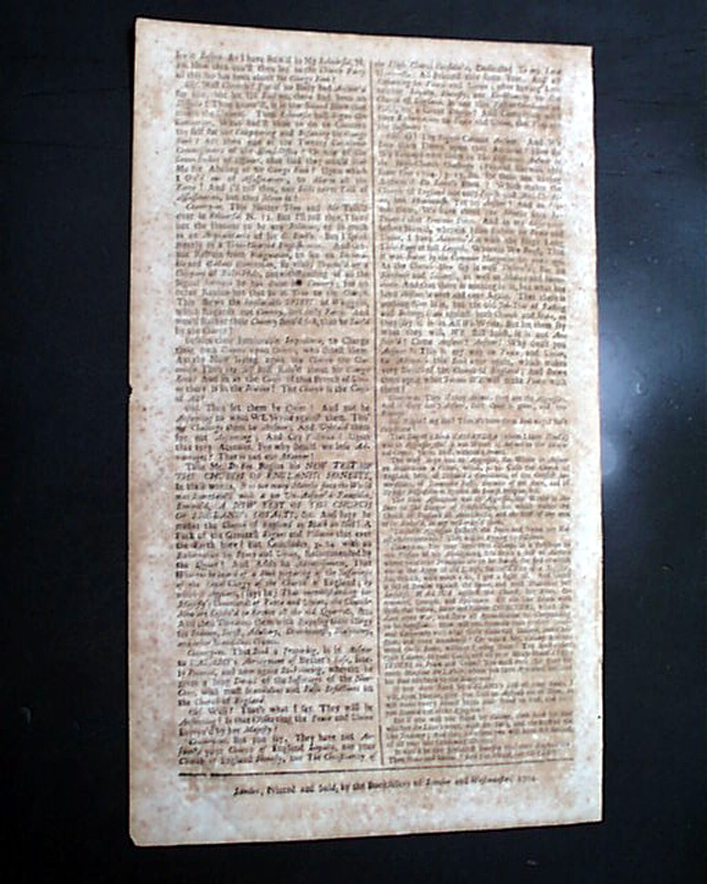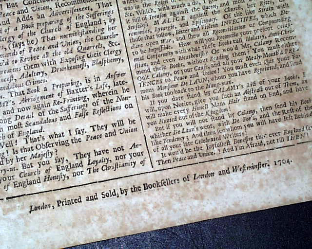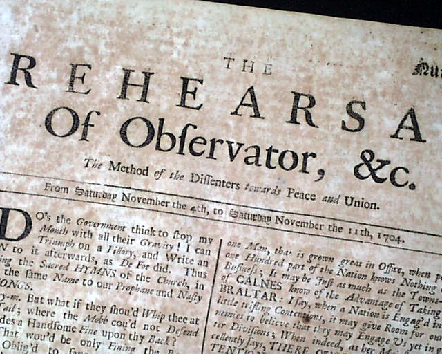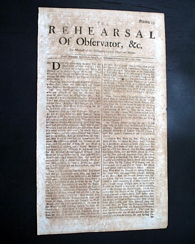Item # 699430 THE REHEARSAL OF OBSERVATOR, London, England Nov. 11, 1704 A variant title --& earlier date--of the newspaper titled "The Rehearsal" and much less common. This is issue #15. In the masthead is the topic of the day: "The Method of the Dissenters Towards Peace & Union".