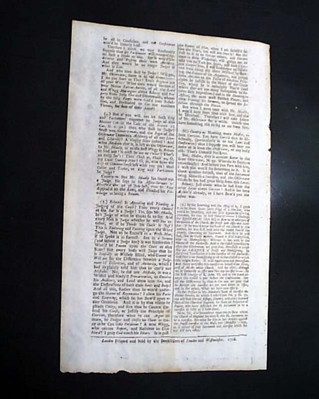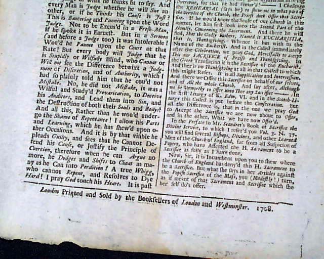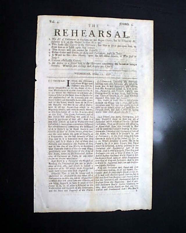 THE REHEARSAL, London, Oct. 13, 1708  A fine single sheet newspaper which lasted only 6 years. It was published by Charles Leslie, considered a violent controversialist who was virtually inextinguishable. Another source notes: "...in August 1704, he had started, in opposition to the ‘Observator’ and Defoe's ‘Review,’ a periodical entitled ‘The Rehearsal.’ It was published...beginning with 10 April 1706. The title was borrowed from the well-known play by the Duke of Buckingham. In form ‘The Rehearsal’ was a lively dialogue between Rehearsal and Observator or Countryman, and, though largely occupied with matters of merely ephemeral interest, afforded Leslie scope for a familiar exposition of his views on serious matters....".