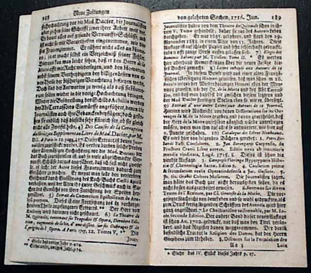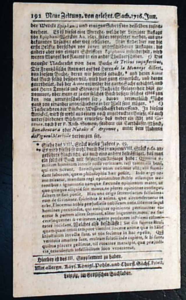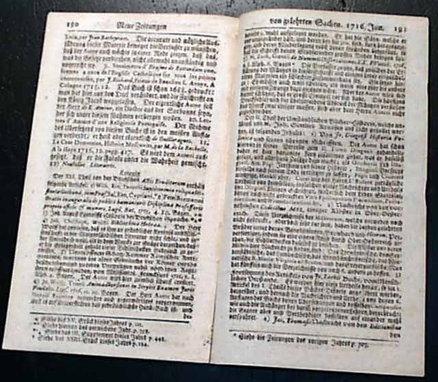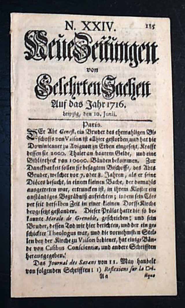 NEUE ZEITUNGEN von GELCHRTEN SACHEN, Leipzig, Germany, June 10, 1716 A very early and tiny newspaper from this largest city in the German province of Saxony. The title roughly translates: "News From Learned Things". Totally in the German language.