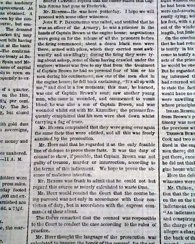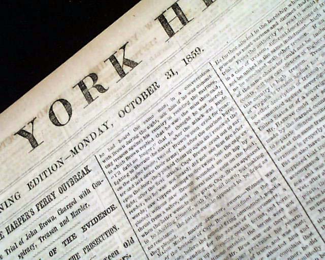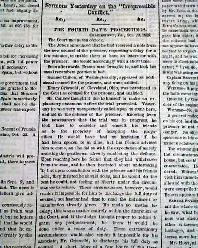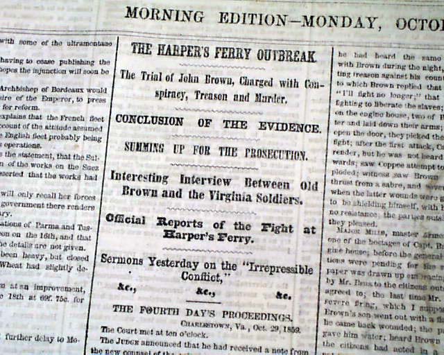 The top of the front page has column heads: "The Harper's Ferry Outbreak" "The Trial of John Brown, Charged with Conspiracy, Treason and Murder" "Conclusion of the Evidence" "Summing Up For the Prosecution" "Interesting Interview Between Old Brown & the Virginia Soldiers" "Official Reports of the Fight at Harper's Ferry" "Sermons Yesterday on the 'Irrepressible Conflict' ".